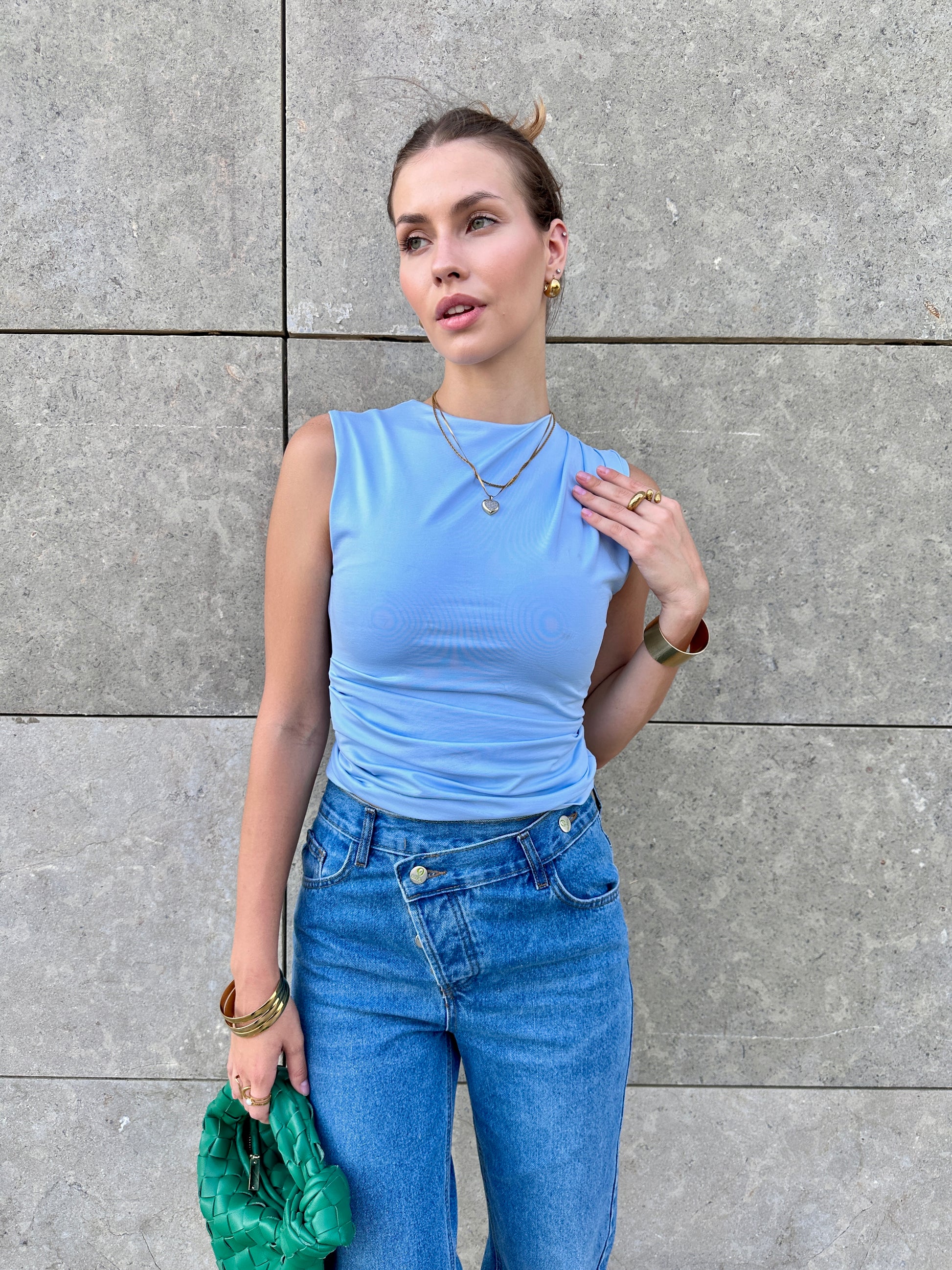 • A sleek essential with a twist—this draped shoulder tank adds subtle drama to a timeless silhouette