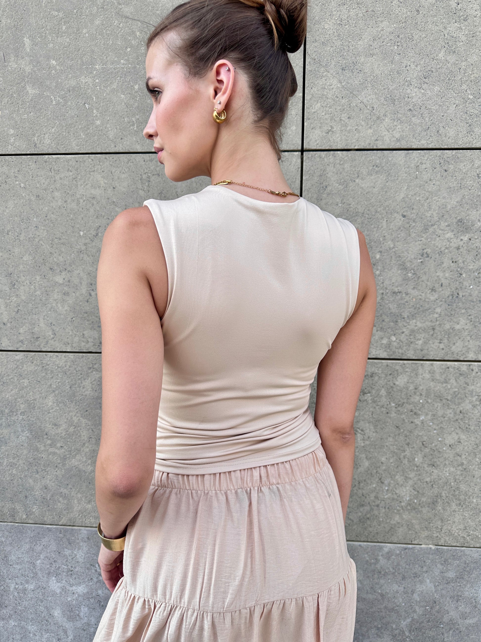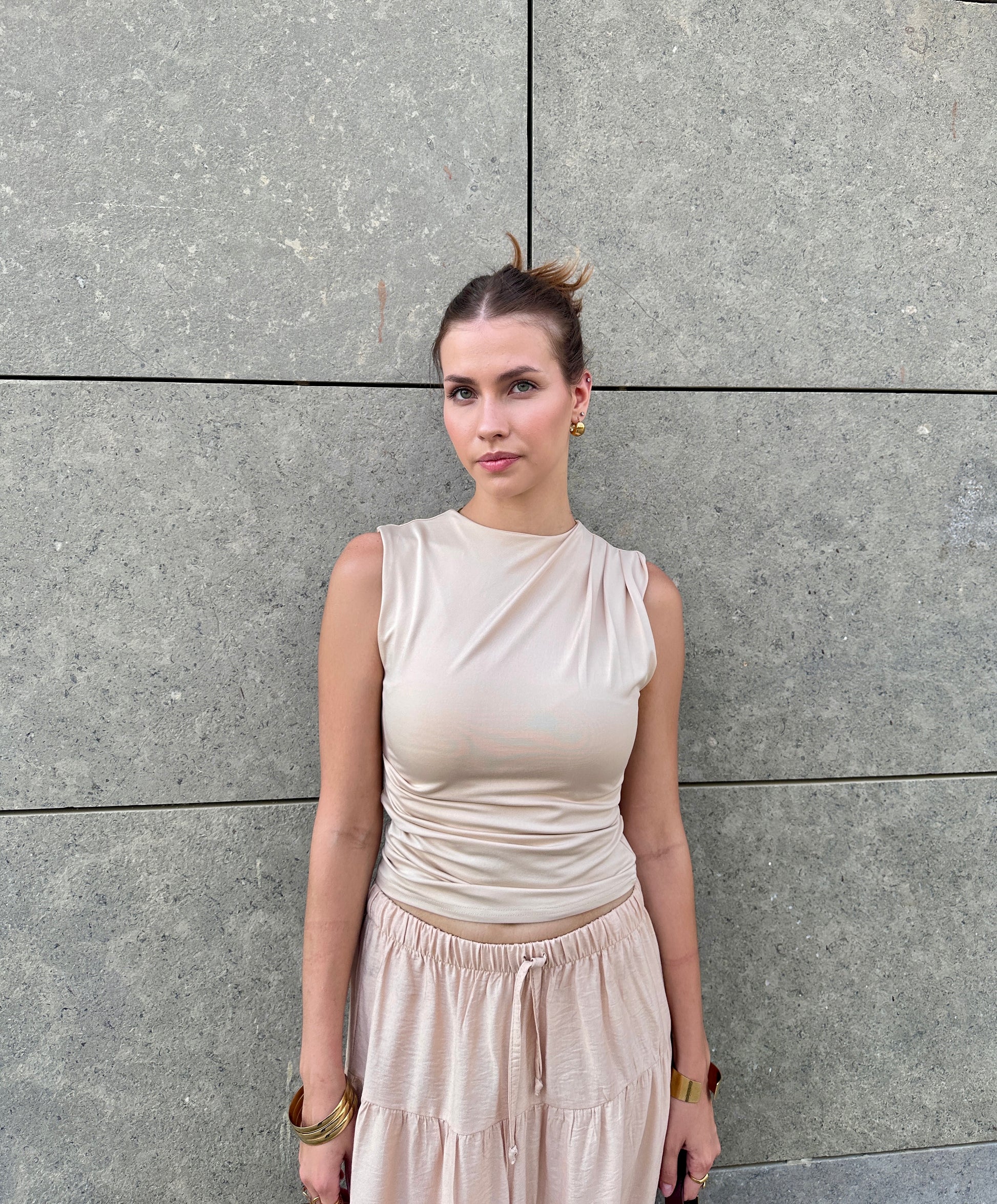 • A sleek essential with a twist—this draped shoulder tank adds subtle drama to a timeless silhouette