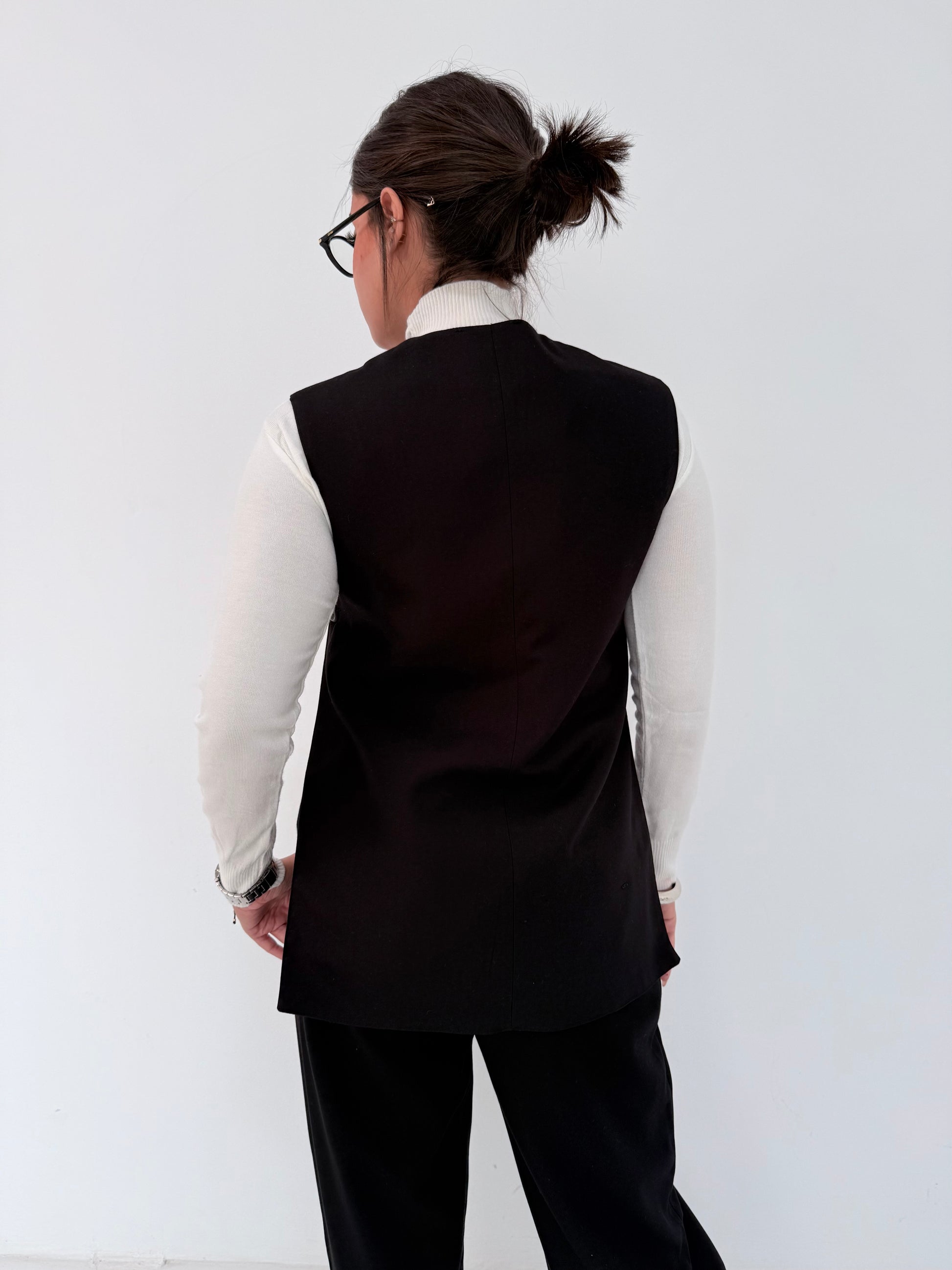 • This sharp, tailored vest redefines minimal sophistication with a clean, sculpted silhouette