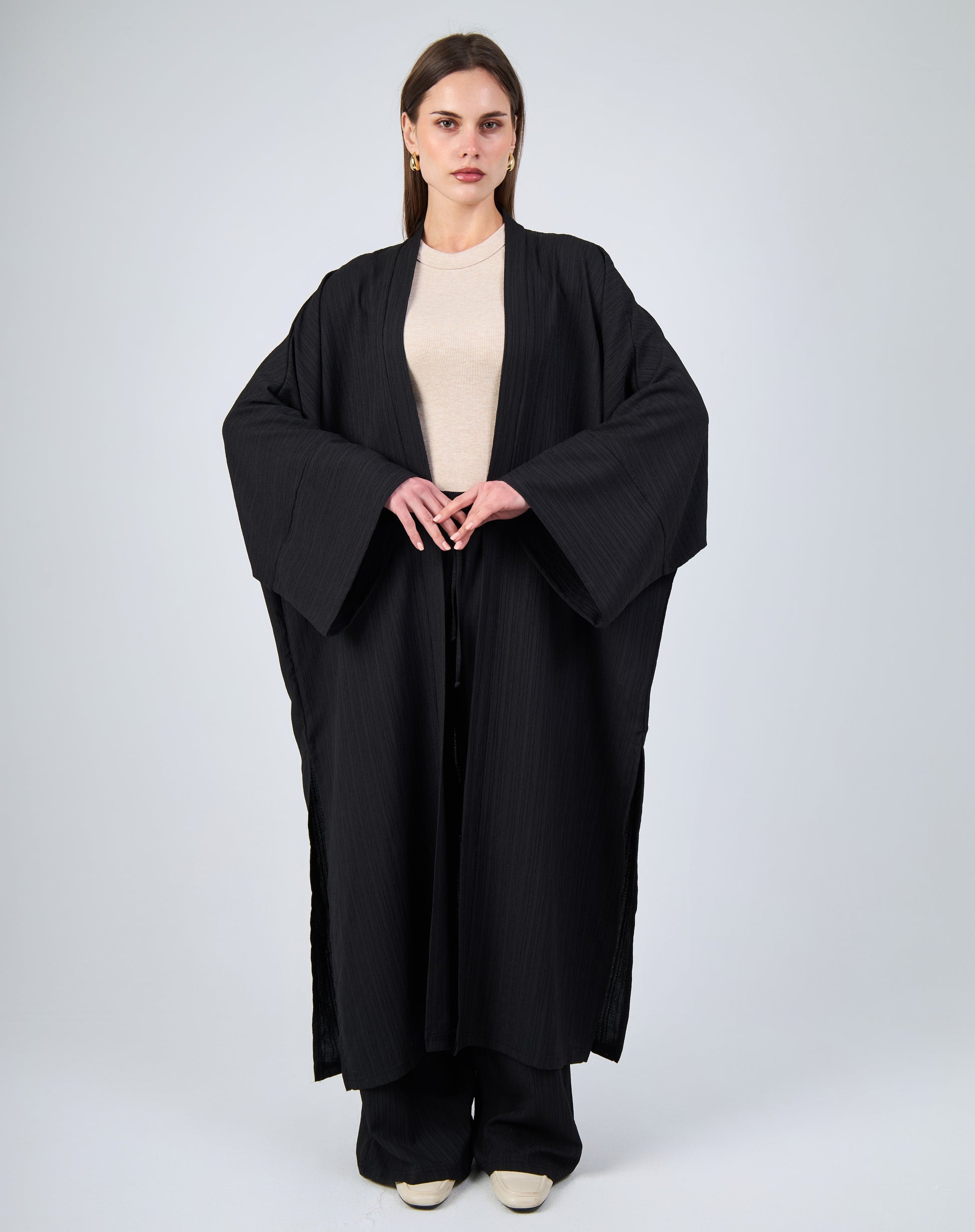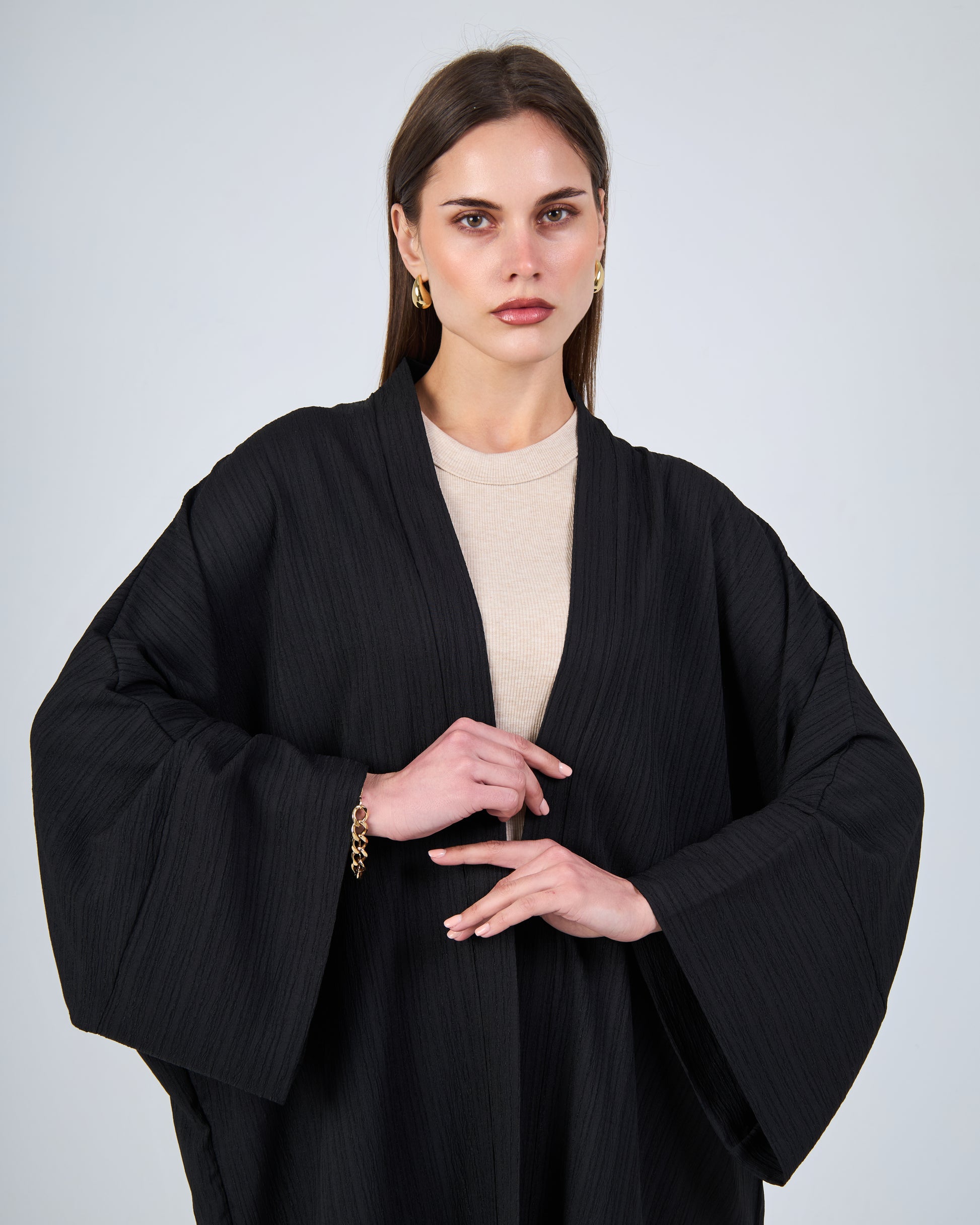 - Wide batwing sleeves for a graceful flow